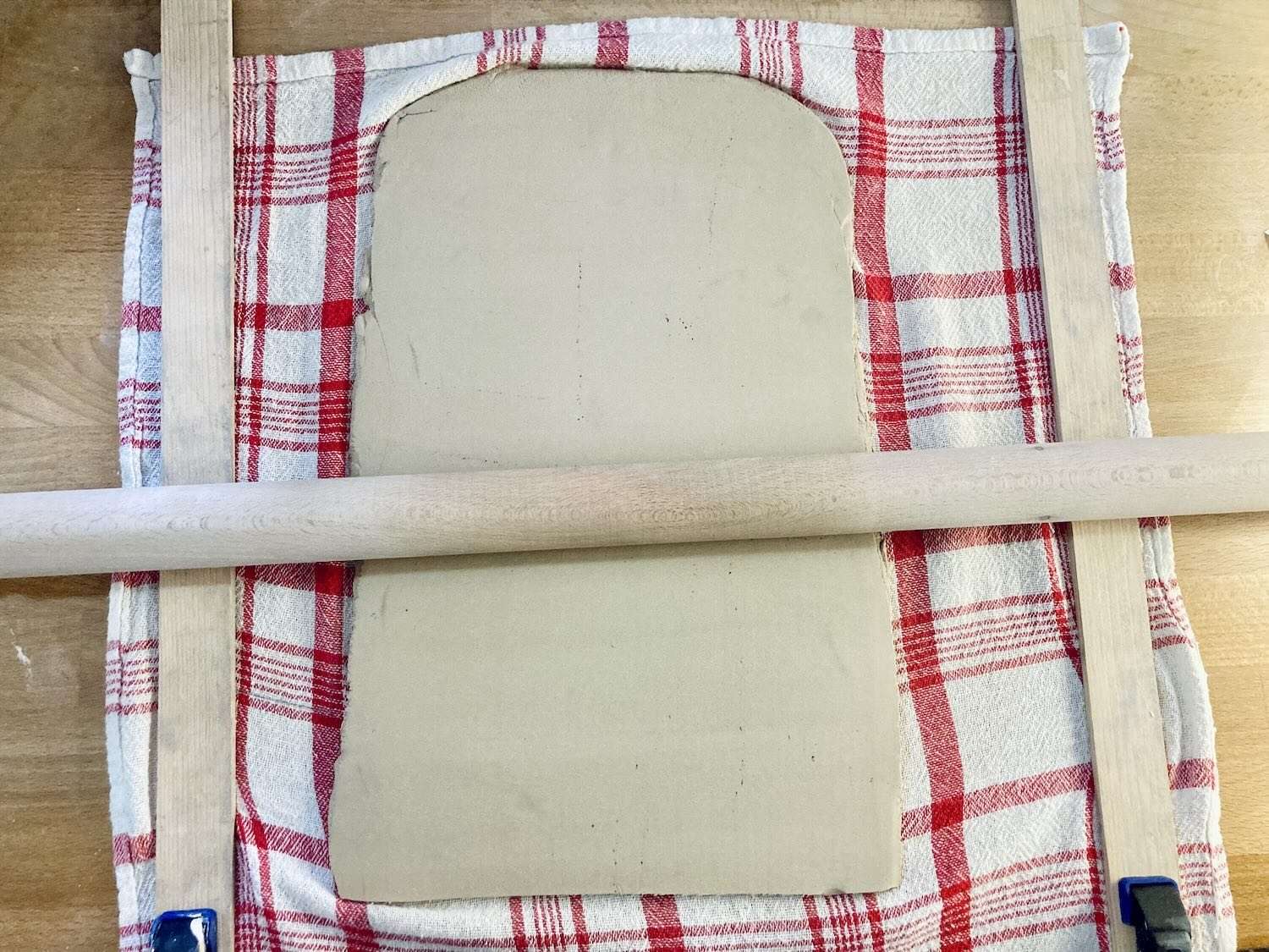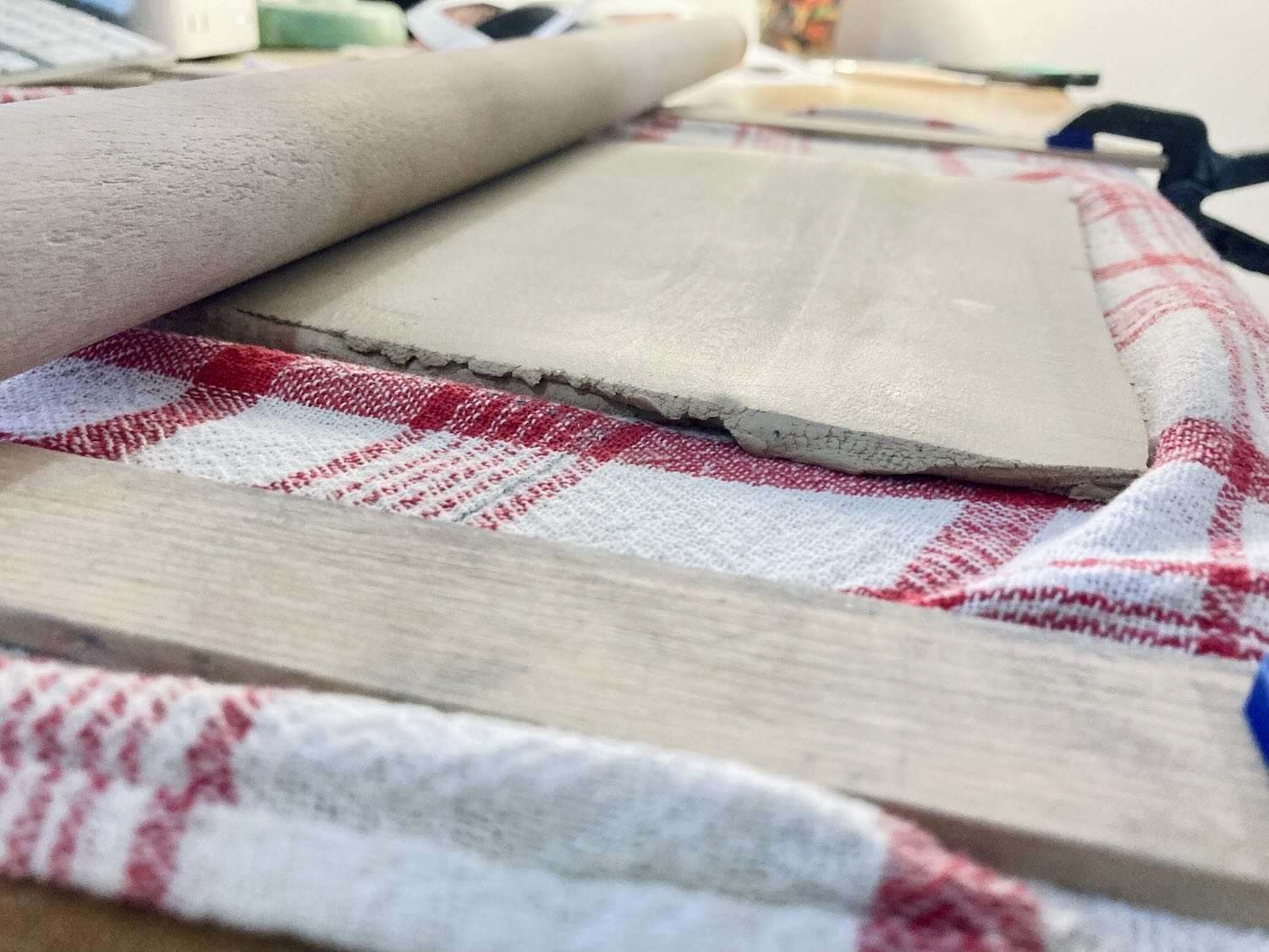 - nyújtófával, vagy egy boros üveggel készíts elő kb. 0,5 cm vastag agyaglapot. Én mindig teszek valami konyharuhát alá, hogy ne tapadjon le a vágódeszkára. Érdemes minden hengerelés után felemelni a darab agyagot és visszatenni és újból hengerelni.