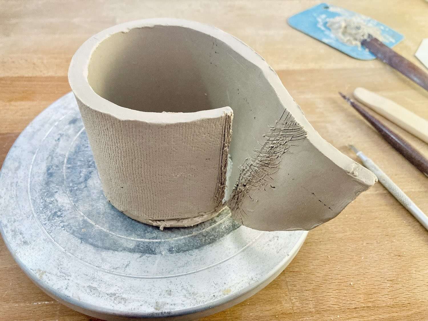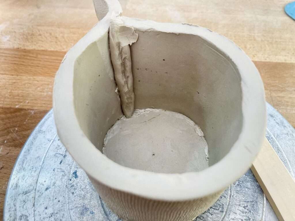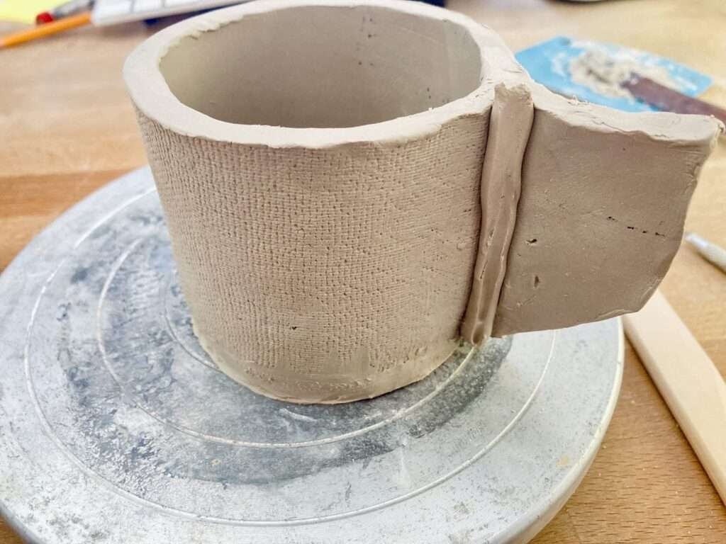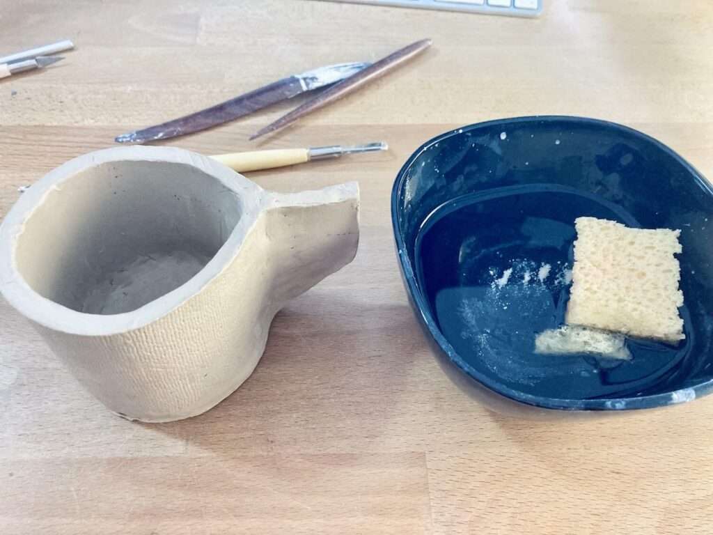 - Ha van füle is a csészének, akkor neked szimpatikus helyre ugyanúgy karcolással és focsolással illeszd a csésze falára, majd dolgozd össze a fallal az illesztéseket.