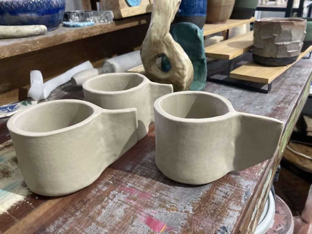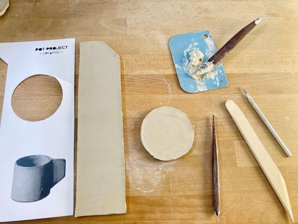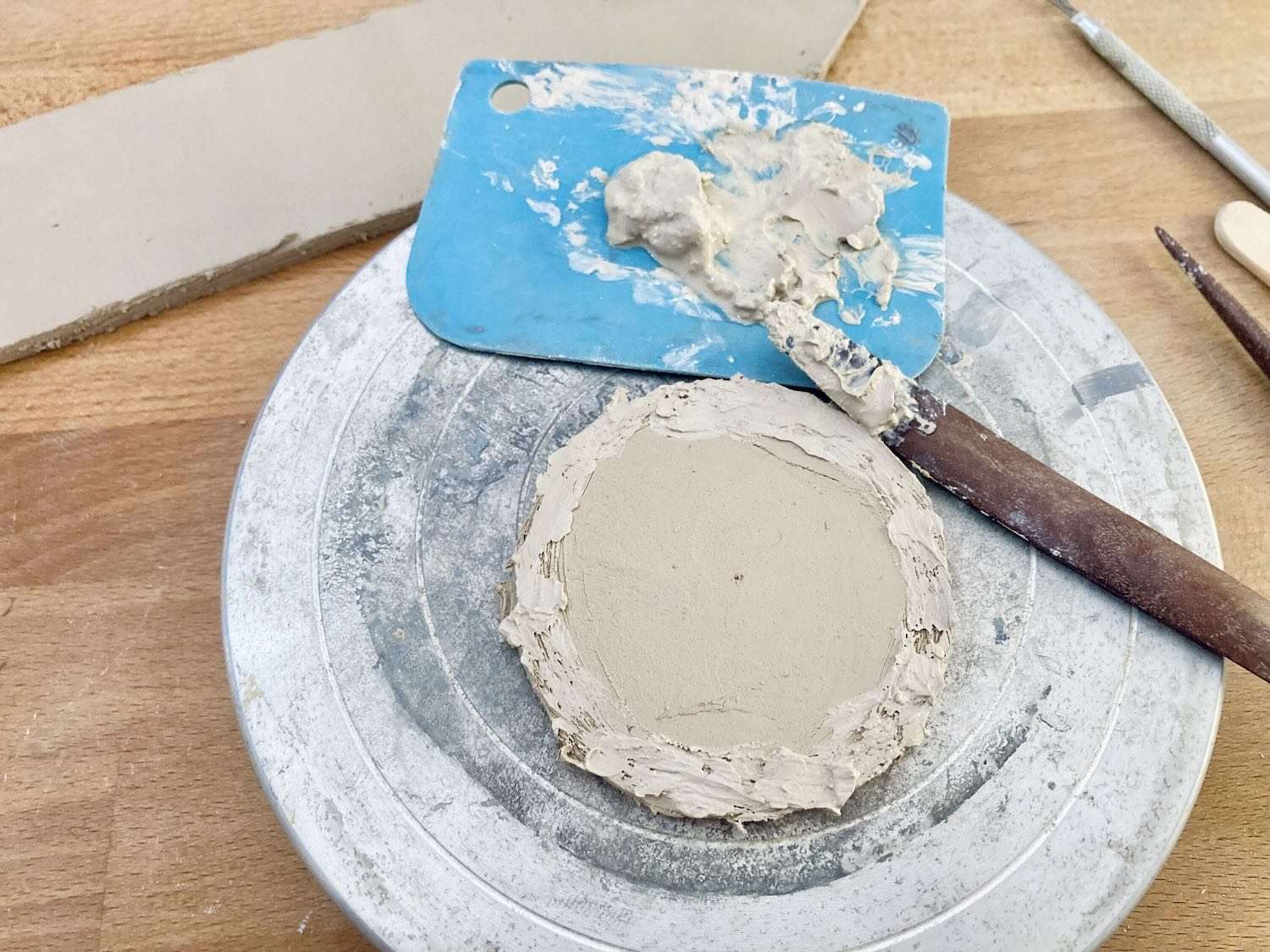 - Ha van füle is a csészének, akkor neked szimpatikus helyre ugyanúgy karcolással és focsolással illeszd a csésze falára, majd dolgozd össze a fallal az illesztéseket.